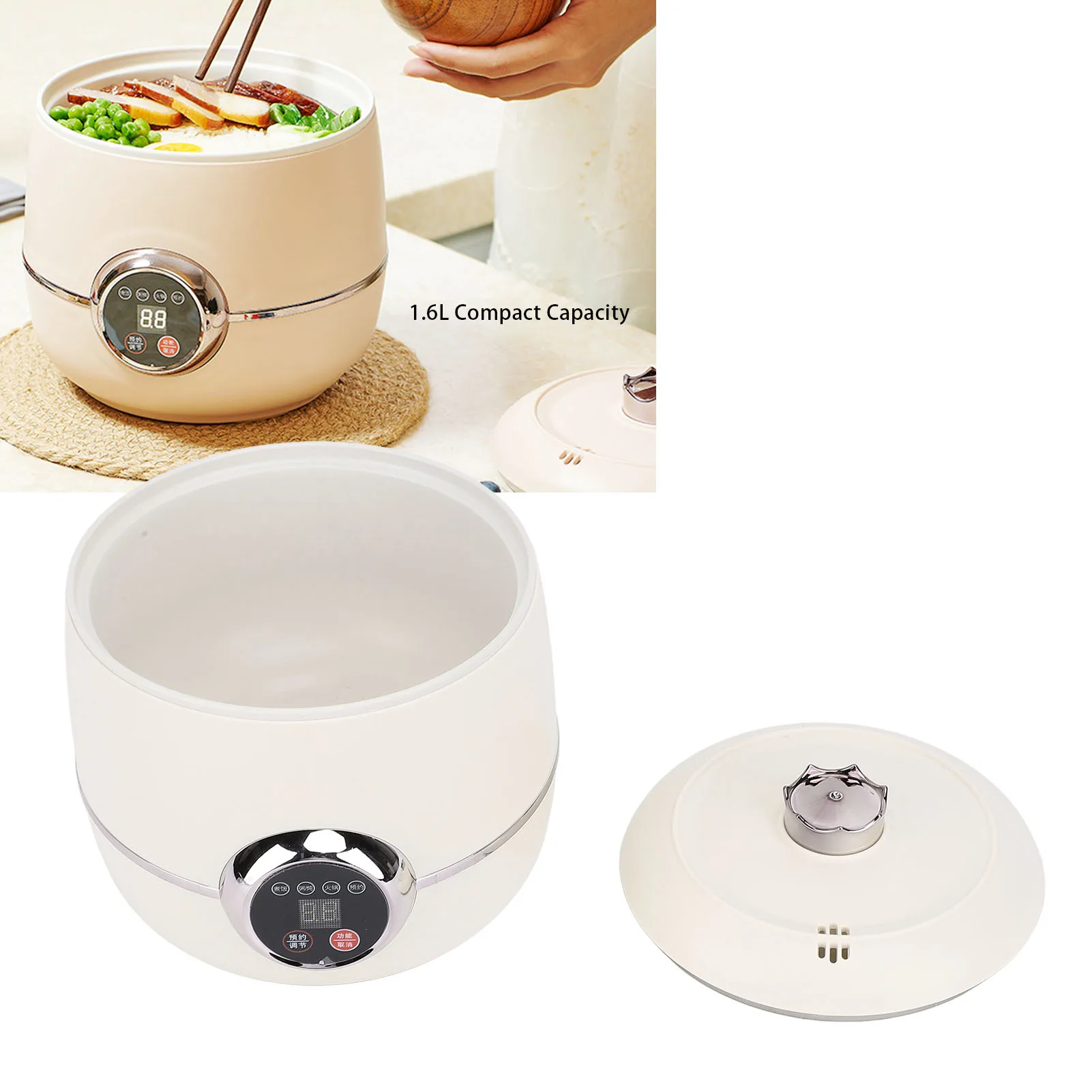 2、User Friendly Operating: Equipped with a 1.6L capacity, this travel rice cooker simplifies cooking with its one touch operating and automatic keep warm function for up to 12 hours. The programmable timer ranges from 0.5 to 9.5 hours, allowing for adjustable cooking schedules. Default cooking times for rice, porridge, and hot pot are thoughtfully set, with automatic temperature control ensuring meals are ready without manual monitoring.